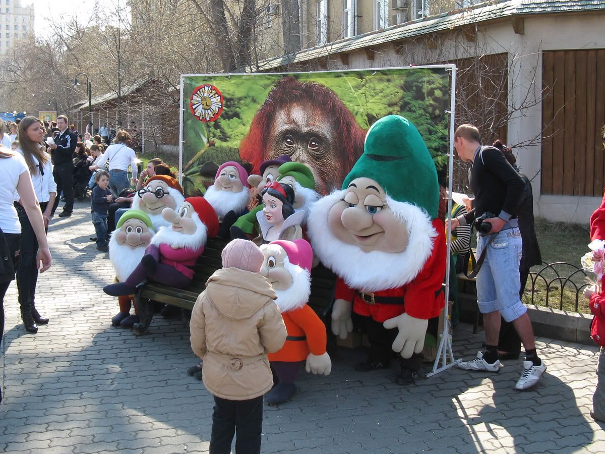 В зоопарке больше всего поразила работа вот этого гнома. Самый большой гном в изумрудно-зелёной шапке — живой, а работает среди шести мёртвых гномов. К сожалению он застеснялся, сел, да ещё оказалось, что работает он в команде с живым фотографом и администраторшей, которую фотограф время от времени бил своим бугром по попе. Ну и с мёртвой белоснежкой ещё и с живыми посетителями парка.