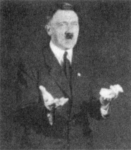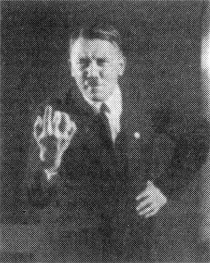 | Подписана: Экзальтированные жесты [Адольфа] Хитлера напоминают язык жестов актёров немого кино. Эти шесть открыток были специально отобраны фюрером — очевидно, с намерением придать им статус объектов культа. Статуарные позы [Адольфа] Хитлера выражают благочестие, самоотверженность и твёрдость, столь важные для мифа о фюрере. Публ. по изд.: Michaud E. Un art de l’éternité: L’image et le temps |